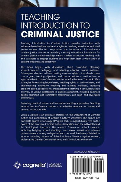 Teaching Introduction to Criminal Justice provides instructors with evidence-based and innovative strategies for teaching introductory criminal justice courses. The text emphasizes the importance of introductory criminal justice courses in providing a strong educational foundation for criminal justice and criminology majors. It offers instructors teaching tools and strategies to engage students and help them learn a wide range of content efficiently and effectively. The book begins with discussions about curriculum planning, student-centered pedagogy, and selecting effective course materials. Subsequent chapters address creating a course syllabus that clearly states course goals, learning objectives, and course policies, as well as how to approach the first day of class and set the tone for the term. The book offers strategies for teaching large classes, teaching hybrid or online classes, and implementing innovative teaching and learning methods, including problem-based, collaborative, and experiential learning. It concludes with an overview of various approaches to student assessment, including backward design, formative and summative assessments, and high- and low-stakes assessments. Featuring practical advice and innovative teaching approaches, Teaching Introduction to Criminal Justice is an effective resource for novice and tenured instructors alike. Laura E. Agnich is an associate professor in the Department of Criminal Justice and Criminology at Georgia Southern University. She earned her doctorate degree in sociology at Virginia Tech. Dr. Agnich has served on the board of the Southern Criminal Justice Association and the editorial board for Sociological Spectrum. Her research focuses on school violence, including bullying, school shootings, and sexual assault and intimate partner violence among college students. Her work has been published in journals including Journal of School Violence, Violence against Women, Violence and Gender, Deviant Behavior, and Criminal Justice Review. Catherine D. Marcum, Ph.D., graduated from Indiana University in Pennsylvania in 2008 with a Ph.D. in criminology. She has published over 50 peer-reviewed journals articles and authored and/or edited over 10 books. Her areas of expertise include cybercrime offending and victimization, correctional issues, and sexual victimization. She is currently the assistant chair of her department, and the editor of Corrections: Policy, Practice, and Research.