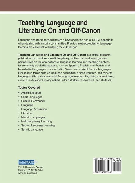 Language and literature teaching are a keystone in the age of STEM, especially when dealing with minority communities. Practical methodologies for language learning are essential for bridging the cultural gap. Teaching Language and Literature On and Off-Canon is a critical research publication that provides a multidisciplinary, multimodal, and heterogenous perspectives on the applications of language learning and teaching practices for commonly studied languages, such as Spanish, English, and French, and less-studied languages, such as Latin, Gaelic, and ancient Semitic languages. Highlighting topics such as language acquisition, artistic literature, and minority languages, this book is essential for language teachers, linguists, academicians, curriculum designers, policymakers, administrators, researchers, and students.