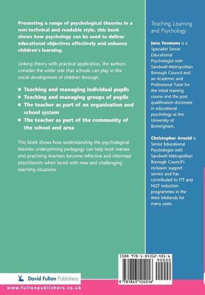 Presenting a range of psychological theories in a non-technical and readable style, this book shows how psychology can be used to effectively deliver educational objectives and enhance children's learning. Linking theory with practical application, the authors consider the wider role that schools can play in the social development of children through: teaching and managing individual pupils teaching and managing groups of pupils the teacher as part of an organisation and school system the teacher as part of the community of the school and area. Structured to reflect the standards for QTS and relevant for key stages 1-4, this book shows how understanding the psychological theories underpinning pedagogy can help both trainee and practising teachers become reflective and informed practitioners when faced with new and challenging teaching situations.
