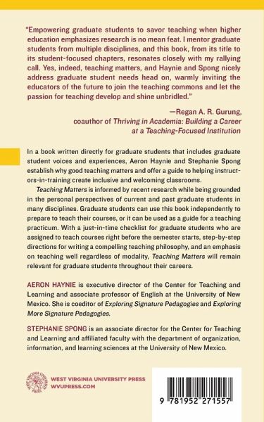 A practical and evidence-based teaching guide for graduate students across all fields. In a book written directly for graduate students that includes graduate student voices and experiences, Aeron Haynie and Stephanie Spong establish why good teaching matters and offer a guide to helping instructors-in-training create inclusive and welcoming classrooms. Teaching Matters is informed by recent research while being grounded in the personal perspectives of current and past graduate students in many disciplines. Graduate students can use this book independently to prepare to teach their courses, or it can be used as a guide for a teaching practicum. With a just-in-time checklist for graduate students who are assigned to teach courses right before the semester starts, step-by-step directions for writing a compelling teaching philosophy, and an emphasis on teaching well regardless of modality, Teaching Matters will remain relevant for graduate students throughout their careers.