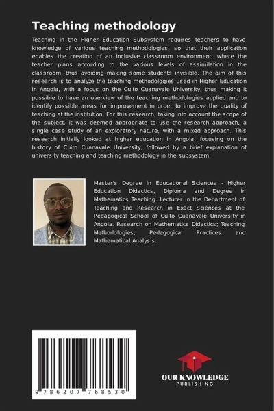 Teaching in the Higher Education Subsystem requires teachers to have knowledge of various teaching methodologies, so that their application enables the creation of an inclusive classroom environment, where the teacher plans according to the various levels of assimilation in the classroom, thus avoiding making some students invisible. The aim of this research is to analyze the teaching methodologies used in Higher Education in Angola, with a focus on the Cuito Cuanavale University, thus making it possible to have an overview of the teaching methodologies applied and to identify possible areas for improvement in order to improve the quality of teaching at the institution. For this research, taking into account the scope of the subject, it was deemed appropriate to use the research approach, a single case study of an exploratory nature, with a mixed approach. This research initially looked at higher education in Angola, focusing on the history of Cuito Cuanavale University, followedby a brief explanation of university teaching and teaching methodology in the subsystem.
