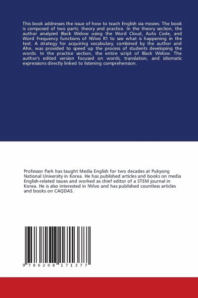 This book addresses the issue of how to teach English via movies. The book is composed of two parts: theory and practice. In the theory section, the author analyzed Black Widow using the Word Cloud, Auto Code, and Word Frequency functions of NVivo R1 to see what is happening in the text. A strategy for acquiring vocabulary, combined by the author and Ahn, was provided to speed up the process of students developing the words. In the practice section, the entire script of Black Widow. The author's edited version focused on words, translation, and idiomatic expressions directly linked to listening comprehension.