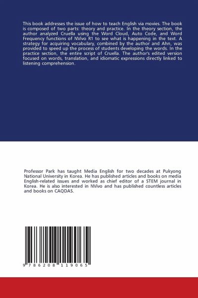 This book addresses the issue of how to teach English via movies. The book is composed of two parts: theory and practice. In the theory section, the author analyzed Cruella using the Word Cloud, Auto Code, and Word Frequency functions of NVivo R1 to see what is happening in the text. A strategy for acquiring vocabulary, combined by the author and Ahn, was provided to speed up the process of students developing the words. In the practice section, the entire script of Cruella. The author's edited version focused on words, translation, and idiomatic expressions directly linked to listening comprehension.