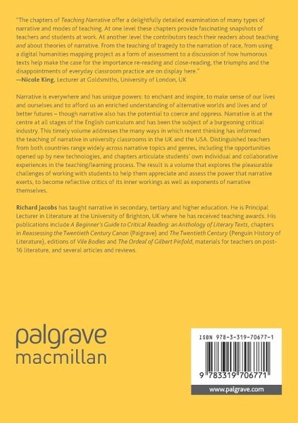 "This timely volume addresses the many ways in which recent thinking has informed the teaching of narrative in university classrooms in the UK and the USA. ...The result is a volume that explores the pleasurable challenges of working with students to help them appreciate and assess the power that narrative exerts, to become reflective critics of its inner workings as well as exponents of narrative themselves." (Spotlight, wordtrade.com, Issue. 27, July, 2018)