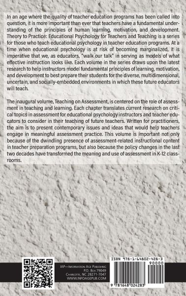 In an age where the quality of teacher education programs has been called into question, it is more important than ever that teachers have a fundamental understanding of the principles of human learning, motivation, and development. Theory to Practice: Educational Psychology for Teachers and Teaching is a series for those who teach educational psychology in teacher education programs. At a time when educational psychology is at risk of becoming marginalized, it is imperative that we, as educators, "walk our talk" in serving as models of what effective instruction looks like. Each volume in the series draws upon the latest research to help instructors model fundamental principles of learning, motivation, and development to best prepare their students for the diverse, multidimensional, uncertain, and socially-embedded environments in which these future educators will teach. The inaugural volume, Teaching on Assessment, is centered on the role of assessment in teaching and learning. Each chapter translates current research on critical topics in assessment for educational psychology instructors and teacher educators to consider in their teaching of future teachers. Written for practitioners, the aim is to present contemporary issues and ideas that would help teachers engage in meaningful assessment practice. This volume is important not only because of the dwindling presence of assessment-related instructional content in teacher preparation programs, but also because the policy changes in the last two decades have transformed the meaning and use of assessment in K-12 classrooms.