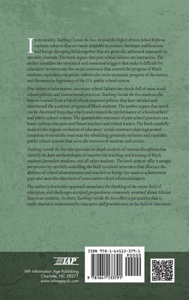 In its totality, this book explores subjects that are rarely available in primary literature publications and brings diverging fields together that are generally addressed separately in specialty journals. The book argues that past school failures are instructive. The author identifies the structural and emotional triggers that make it difficult for educators' to overcome the social constructs that control the progress of Black students, reproduce inequities, subvert the socio-economic progress of the nation, and threaten the legitimacy of the U.S. public school system. One failure is informative; successive school failures are chock-full of must avoid school policies and instructional practices. The book analyzes the lessons learned from a list of school-imposed policies that have molded and determined the academic progress of Black students. The author argues that much can be discerned from that which undermined the performance of schoolteachers' and public school systems. The quantifiable outcomes of past school practices can better inform educators and future teachers and school leaders. The book carefully analyzes the organic evolution of educators' social constructs that regenerated inequities to reveal the road map for rebuilding genuinely inclusive and equitable public school systems that serve the interests of students and society. The book also provides in-depth analysis of various disciplines that identify the best methodologies to improve the teaching and learning of Black students, homeless students, and all other students. The book aims to offer a unique perspective by carefully unfolding the built in school structures that obstruct the abilities of school administrators and teachers to bridge the student achievement gaps and meet the objectives of consecutive school reform initiatives. The author's distinctive approach stimulates the thinking of the entire field of education, and challenges accepted propositions commonly assumed about African American students. In short, this book offers a perspective that is rarely shared or understood by educators and practitioners in the field of education.