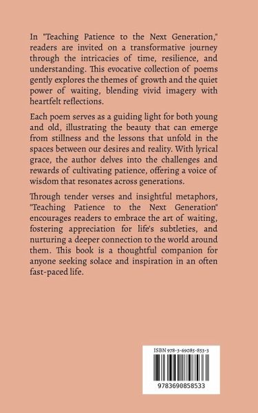In "Teaching Patience to the Next Generation," readers are invited on a transformative journey through the intricacies of time, resilience, and understanding. This evocative collection of poems gently explores the themes of growth and the quiet power of waiting, blending vivid imagery with heartfelt reflections. Each poem serves as a guiding light for both young and old, illustrating the beauty that can emerge from stillness and the lessons that unfold in the spaces between our desires and reality. With lyrical grace, the author delves into the challenges and rewards of cultivating patience, offering a voice of wisdom that resonates across generations. Through tender verses and insightful metaphors, "Teaching Patience to the Next Generation" encourages readers to embrace the art of waiting, fostering appreciation for life's subtleties, and nurturing a deeper connection to the world around them. This book is a thoughtful companion for anyone seeking solace and inspiration in an often fast-paced life.