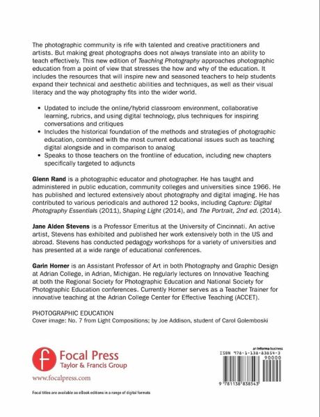 Glenn Rand is a photographic educator and photographer. He has taught and administered in public education, community colleges and universities since 1966. For the past three years he has been associated with Adrian College. He has authored eleven books including Teaching Photography (2006), The Portrait (2009), Capture: Digital Photography Essentials (2011), and contributes regularly to various periodicals. Jane Alden Stevens is a Professor Emeritus at the University of Cincinnati. An active artist, Stevens has exhibited and published her work extensively both in the US and abroad. Stevens has conducted pedagogy workshops for a variety of universities and has presented at a wide range of educational conferences. Garin Horner is an Assistant Professor of Art in both Photography and Graphic Design at Adrian College, in Adrian, Michigan. He regularly lectures on Innovative Teaching at both the Regional Society for Photographic Education and National Society for Photographic Education conferences. Currently Horner serves as a Teacher Trainer for innovative teaching at the Adrian College Center for Effective Teaching (ACCET).
