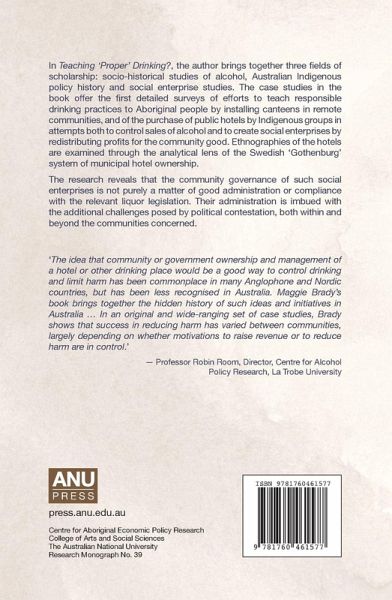 In Teaching 'Proper' Drinking?, the author brings together three fields of scholarship: socio-historical studies of alcohol, Australian Indigenous policy history and social enterprise studies. The case studies in the book offer the first detailed surveys of efforts to teach responsible drinking practices to Aboriginal people by installing canteens in remote communities, and of the purchase of public hotels by Indigenous groups in attempts both to control sales of alcohol and to create social enterprises by redistributing profits for the community good. Ethnographies of the hotels are examined through the analytical lens of the Swedish 'Gothenburg' system of municipal hotel ownership. The research reveals that the community governance of such social enterprises is not purely a matter of good administration or compliance with the relevant liquor legislation. Their administration is imbued with the additional challenges posed by political contestation, both within and beyond the communities concerned.