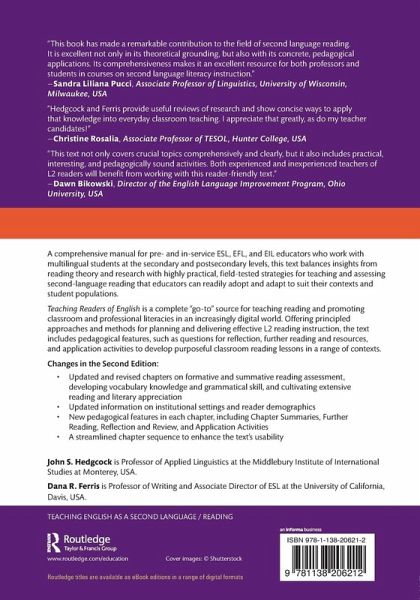 A comprehensive manual for pre- and in-service ESL, EFL, and EIL educators who work with multilingual students at the secondary and postsecondary levels, this text balances insights from reading theory and research with highly practical, field-tested strategies for teaching and assessing second-language reading that educators can readily adopt and adapt to suit their contexts and student populations.