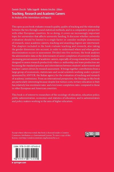 This open access book evaluates research quality, quality of teaching and the relationship between the two through sound statistical methods, and in a comparative perspective with other European countries. In so doing, it covers an increasingly important topic for universities that affects university funding. It discusses whether university evaluation should be limited to a single factor or consider multiple dimensions of research, since academic careers, teaching and awarding degrees are intertwined. The chapters included in the book evaluate teaching and research, also taking the gender dimension into account, in order to understand where and when gender discrimination occurs in assessment. Divided into five sections, the book analyses the administrative data on the determinants of career completion of university students; increasing precariousness of academic careers, especially of young researchers; methods designed to assess research productivity when co-authorship and team production are becoming the standard practice; and interrelations between students' achievements and teachers' careers driven by research assessment. It brings together contributions from a large group of economists, statisticians and social scientists working under a project sponsored by ANVUR, the Italian agency for the evaluation of teaching and research of academic institutions. From an international perspective, the findings in this book are particularly interesting because despite low tuition costs, tertiary education in Italy has relatively low enrolment rates and even lower completion rates compared to those in other European and American countries.