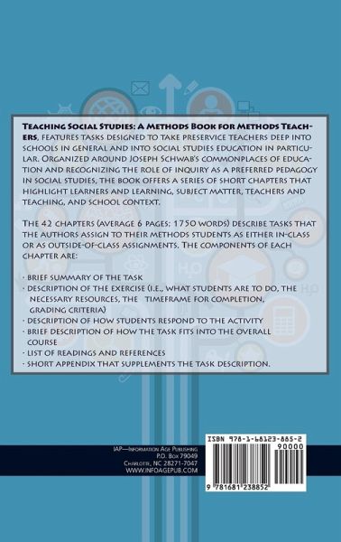 Teaching Social Studies: A Methods Book for Methods Teachers, features tasks designed to take preservice teachers deep into schools in general and into social studies education in particular. Organized around Joseph Schwab's commonplaces of education and recognizing the role of inquiry as a preferred pedagogy in social studies, the book offers a series of short chapters that highlight learners and learning, subject matter, teachers and teaching, and school context. The 42 chapters describe tasks that the authors assign to their methods students as either in¿class or as outside¿of¿class assignments. The components of each chapter are: ¿¿ Summary of the task ¿¿ Description of the exercise (i.e., what students are to do, the necessary resources, the timeframe for completion, grading criteria) ¿¿ Description of how students respond to the activity ¿¿ Description of how the task fits into the overall course ¿¿ List of readings and references ¿¿ Appendix that supplements the task description