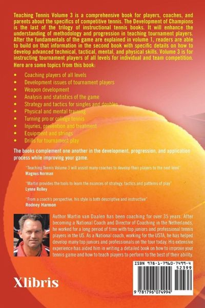 Teaching Tennis Volume 3 is a comprehensive book for players, coaches, and parents about the specifics of competitive tennis. The Development of Champions is the last of the trilogy of instructional tennis books. It will enhance the understanding of methodology and progression in teaching tournament players. After the fundamentals of the game are explained in volume 1, readers are able to build on that information in the second book with specific details on how to develop advanced technical, tactical, mental, and physical skills. Volume 3 is for instructing tournament players of all levels for individual and team competition. It is beneficial for readers to examine these books in order. The books complement one another in the development, progression, and application process while improving your game.
