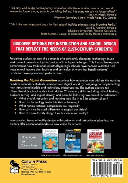 "This might well be THE contemporary manual for effective education reform. In a world where the future is now, schools are falling behind. It is a lag we can no longer afford." -Sean M. Nosek, Principal Westview Secondary School, Maple Ridge, BC, Canada "This is the most important book about high schools since Breaking Ranks for school facilities planners." -David E. Anstrand, Principal, Education Environment Planning Consultants Board Member, Council of Educational Facility Planners International Discover options for instruction and school design that reflect the needs of 21st-century students! Preparing students to meet the demands of a constantly changing, technology-driven environment presents today's educators with unique challenges. This innovative resource demonstrates how traditional, industrial-type high schools have become outdated and helps school leaders plan facilities and curriculum in ways that benefit students' academic development and performance. Teaching the Digital Generation examines how educators can address the learning needs of secondary students immersed in a digital world by designing and implementing new instructional models and technology infrastructure. The authors explore ten alternative high school models that address 21st-century skills such as critical thinking, problem solving, and digital literacy, and pose five critical considerations: What should instruction and learning look like in a 21st-century school? How can technology foster this kind of learning? What noninstructional components are required? How can time be used differently to support our vision? How can new facility design turn this vision into reality? Incorporating issues of facility design with curriculum and instructional planning, the authors offer educational leaders a new vision for schools.
