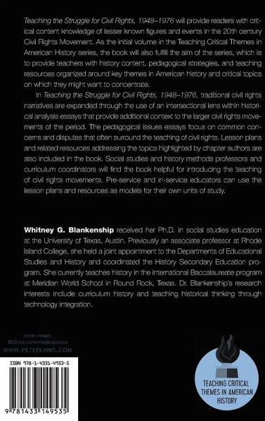 In Teaching the Struggle for Civil Rights, 1948-1976, traditional civil rights narratives are expanded through the use of an intersectional lens within historical analysis essays that provide additional context to the larger civil rights movements of the period. The pedagogical issues essays focus on common concerns and disputes that often surround the teaching of civil rights. Lesson plans and related resources addressing the topics highlighted by chapter authors are also included in the book. Social studies and history methods professors and curriculum coordinators will find the book helpful for introducing the teaching of civil rights movements. Pre-service and in-service educators can use the lesson plans and resources as models for their own units of study.