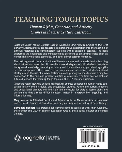 Teaching Tough Topics: Human Rights, Genocide, and Atrocity Crimes in the 21st Century Classroom provides readers a comprehensive exploration into the teaching of difficult historical and contemporary subjects within academic settings. The book addresses the challenges and methodologies pertinent to presenting topics such as human rights violations, genocide, and other crimes against humanity. The text begins with an examination of the motivations and rationale behind teaching about crimes and atrocities. It then discusses strategies to build students' requisite background knowledge, ensuring accuracy and the avoidance of perpetuating myths or misconceptions. The book further emphasizes interactive, student-centered strategies and the use of survivor testimonies and primary sources to make a tangible connection to the past and present realities of atrocities. The final section looks at future directions for teaching tough topics in the 21st century classroom. Teaching Tough Topics is an ideal textbook for courses centered on human rights education, history, social studies, and pedagogical studies. Future and current teachers and educational planners will find it particularly useful for crafting lesson plans and curriculums that discuss difficult subject matter in a responsible, engaging, and informative way.