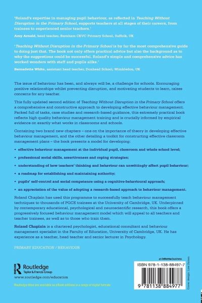 The issue of behaviour has, and always will be, a main dilemma facing schools. Encouraging positive relationships whilst preventing disruption, and motivating students to learn, raises concerns for any teacher. This fully updated second edition of Teaching without Disruption in the Primary School offers a comprehensive and constructive approach to developing effective behaviour management. Packed full of tasks, case studies, and research-based guidance, this extremely practical book reflects high quality behaviour management training and is crucially informed by empirical evidence on exactly what works in classrooms and schools. Containing two brand new chapters - one on the importance of theory in developing effective behaviour management, and the other detailing a toolkit for constructing effective classroom management plans - the book presents a model for developing: effective behaviour management at the individual pupil, classroom and whole school level professional social skills, assertiveness and coping strategies understanding of how teachers' thinking and behaviour can unwittingly affect pupil behaviour a roadmap for establishing and maintaining authority pupils' self-control and social competence using a cognitive-behavioural approach an appreciation of the value of adopting a research-based approach to behaviour management. Roland Chaplain has used this programme to successfully teach behaviour management techniques to thousands of PGCE trainees at the University of Cambridge, UK. Underpinned by contemporary educational, psychological and neuroscientific research, this book offers a progressively focused behaviour management model which will appeal to all teachers and teacher trainees, as well as to those who train them.