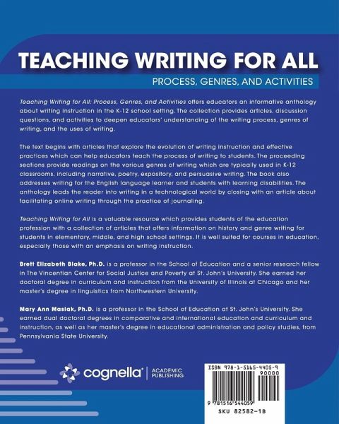 Teaching Writing for All: Process, Genres, and Activities offers educators an informative anthology about writing instruction in the K-12 school setting. The collection provides articles, discussion questions, and activities to deepen educators’ understanding of the writing process, genres of writing, and the uses of writing. The text begins with articles that explore the evolution of writing instruction and effective practices which can help educators teach the process of writing to students. The proceeding sections provide readings on the various genres of writing which are typically used in K-12 classrooms, including narrative, poetry, expository, and persuasive writing. The book also addresses writing for the English language learner and students with learning disabilities. The anthology leads the reader into writing in a technological world by closing with an article about facilitating online writing through the practice of journaling. Teaching Writing for All is a valuable resource which provides students of the education profession with a collection of articles that offers information on history and genre writing for students in elementary, middle, and high school settings. It is well suited for courses in education, especially those with an emphasis on writing instruction. Brett Elizabeth Blake, Ph.D. is a professor in the School of Education and a senior research fellow in The Vincentian Center for Social Justice and Poverty at St. John’s University. She earned her doctoral degree in curriculum and instruction from the University of Illinois at Chicago and her master’s degree in linguistics from Northwestern University. Mary Ann Maslak, Ph.D. is a professor in the School of Education at St. John’s University. She earned dual doctoral degrees in comparative and international education and curriculum and instruction, as well as her master’s degree in educational administration and policy studies, from Pennsylvania State University.