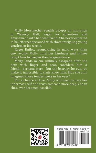 Molly Merriwether readily accepts an invitation to Waverly Hall, eager for adventure and amusement with her best friend. She never expected to be left unchaperoned with three intriguing young gentlemen for weeks. Roger Bailey, recuperating in more ways than one, avoids Molly until her kindness and humor tempt him to deepen their acquaintance. Molly lands in one unlikely escapade after the next with Roger and soon considers him a friend-perhaps more-but the barriers he puts up make it impossible to truly know him. Has she only imagined those tender looks in his eyes? For a chance at love, Molly will need to bare her innermost self and trust someone more deeply than she's ever dreamed possible.