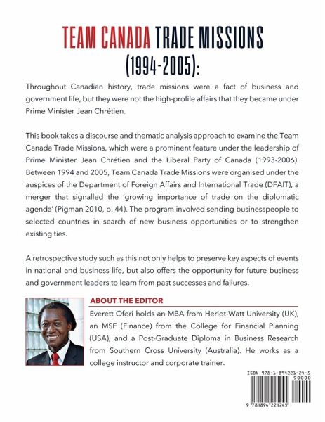 Team Canada Trade Missions were the brainchild of Prime Minister Jean Chretien who led many trade missions to countries around the world in the hope of drumming up business for Canada and changing the longstanding image that people around the world held of Canada as a land of snow and wheat. The Prime Minister wanted the whole world to know that Canada was a leader in technology and that it was a country that was open to friendship with the world. Not everyone, however, believed that the Team Canada Trade Missions were as successful as the Prime Minister and his supporters made them out to be. Interestingly, some of the most passionate opponents of the trade missions, such as Prime Minister Stephen Harper, jumped onto the trade mission bandwagon once he was no longer in opposition. This shows that some of the rhetoric surrounding trade missions were not necessarily always honest. Using discourse analysis, thematic analysis, and the views of a panel of Canadian experts, Team Canada Trade Missions (1994-2005): A Popular Prime Minister's Passion Project delves into the diverse discourses that surrounded the trade missions and identifies the major players, both proponents and critics. In the end, this retrospective work captures the political and business complexities of promoting a country while also trying to measure, besides profits, nebulous benefits such as prestige, power, and publicity.