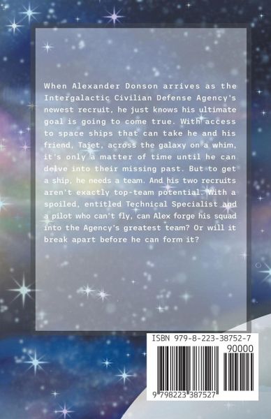 When Alexander Donson arrives as the Intergalactic Civilian Defense Agency's newest recruit, he just knows his ultimate goal is going to come true. With access to space ships that can take he and his friend, Tajet, across the galaxy on a whim, it's only a matter of time until he can delve into their missing past. But to get a ship, he needs a team. And his two recruits aren't exactly top-team potential. With a spoiled, entitled Technical Specialist and a pilot who can't fly, can Alex forge his squad into the Agency's greatest team? Or will it break apart before he can form it?