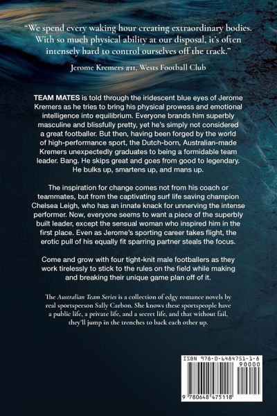 "We spend every waking hour creating extraordinary bodies. With so much physical ability at our disposal, it's often intensely hard to control ourselves off the track." Jerome Kremers #11, Wests Football Club TEAM MATES is told through the iridescent blue eyes of Jerome Kremers as he tries to bring his physical prowess and emotional intelligence into equilibrium. Everyone brands him superbly masculine and blissfully pretty, yet he's simply not considered a great footballer. But then, having been forged by the world of high-performance sport, the Dutch-born, Australian-made Kremers unexpectedly graduates to being a formidable team leader. Bang. He skips great and goes from good to legendary. He bulks up, smartens up, and mans up. The inspiration for change comes not from his coach or teammates, but from the captivating surf life saving champion Chelsea Leigh, who has an innate knack for unnerving the intense performer. Now, everyone seems to want a piece of the superbly built leader, except the sensual woman who inspired him in the first place. Even as Jerome's sporting career takes flight, the erotic pull of his equally fit sparring partner steals the focus. Come and grow with four tight-knit male footballers as they work tirelessly to stick to the rules on the field while making and breaking their unique game plan off of it. The Australian Team Series is a collection of edgy romance novels by real sportsperson Sally Carbon. She knows these sportspeople have a public life, a private life, and a secret life, and that without fail, they'll jump in the trenches to back each other up. C'mon-join the Australian Team.