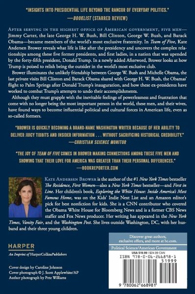 From the #1 New York Times bestselling author of The Residence and First Women?also a New York Times bestseller?comes a poignant, news-making look at the lives of the five former presidents in the wake of their White House years, including the surprising friendships they have formed through shared perspective and empathy?now with a new afterword After serving the highest office of American government, five men?Jimmy Carter, the late George H. W. Bush, Bill Clinton, George W. Bush, and Barack Obama?became members of the world's most exclusive fraternity. In Team of Five, Kate Andersen Brower goes beyond the White House to uncover what, exactly, comes after the presidency, offering a glimpse into the complex relationships of these five former presidents, and how each of these men views his place in a nation that has been upended by the Oval Office's current, norm-breaking occupant, President Donald Trump. With an empathetic yet critical eye and firsthand testimony from the Carters, Donald Trump, and the top aides, friends, and family members of the five former presidents, Team of Five takes us inside the exclusive world of these powerful men and their families, including the unlikely friendship between George W. Bush and Michelle Obama, the last private visits Bill Clinton and Barack Obama shared with George H.W. Bush, and the Obamas' flight to Palm Springs after Donald Trump's inauguration. Perhaps most timely, this insightful, illuminating book overflows with anecdotes about how the ex-presidents are working to combat President Trump's attempts to undo the achievements and hard work accomplished during their own terms. Perhaps most poignantly, Team of Five sheds light on the inherent loneliness and inevitable feelings of powerlessness and frustration that come with no longer being the most important person in the world, but a leader with only symbolic power. There are ways, though, that these men, and their wives, have become powerful political and cultural forces in American life, even as so-called ?formers.? Team of Five includes 16 pages of color photographs.
