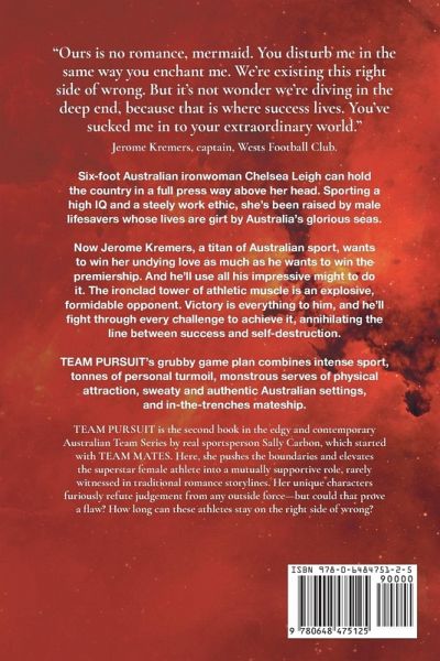 "Ours is no romance, mermaid. You disturb me in the same way you enchant me. We're existing this right side of wrong. But it's not wonder we're diving in the deep end, because that is where success lives. You've sucked me in to your extraordinary world." Jerome Kremers, captain, Wests Football Club. Six-foot Australian ironwoman Chelsea Leigh can hold the country in a full press way above her head. Sporting a high IQ and a steely work ethic, she's been raised by male lifesavers whose lives are girt by Australia's glorious seas. Now Jerome Kremers, a titan of Australian sport, wants to win her undying love as much as he wants to win the premiership. And he'll use all his impressive might to do it. The ironclad tower of athletic muscle is an explosive, formidable opponent. Victory is everything to him, and he'll fight through every challenge to achieve it, annihilating the line between success and self-destruction. TEAM PURSUIT's grubby game plan combines intense sport, tonnes of personal turmoil, monstrous serves of physical attraction, sweaty and authentic Australian settings, and in-the-trenches mateship. TEAM PURSUIT is the second book in the edgy and contemporary Australian Team Series by real sportsperson Sally Carbon, which started with TEAM MATES. Here, she pushes the boundaries and elevates the superstar female athlete into a mutually supportive role, rarely witnessed in traditional romance storylines. Her unique characters furiously refute judgement from any outside force-but could that prove a flaw? How long can these athletes stay on the right side of wrong?