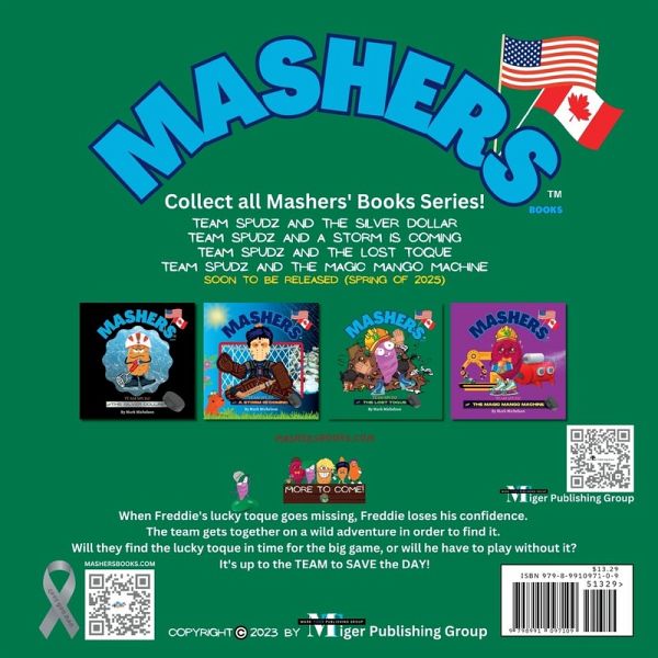 When Freddie's lucky toque goes missing, Freddie loses his confidence. The team gets together on a wild adventure in order to find it. Will they find the lucky toque in time for the big game, or will he have to play without it? It's up to the TEAM to SAVE the DAY! "TEAM SPUDZ" is about five fictional characters who just want to have fun playing their favorite sport, hockey. Join them on their journey as they take Hockey to a whole new level of PLAY! You don't have to only love HOCKEY or POTATOES to LOVE THIS BOOK! The World Is Colorful When You're With The Spudz. Mashers' Books provide stories of life lessons, exciting journeys, and fun reads as "TEAM SPUDZ" bring to life the joys of everyday friendship, overcoming obstacles, perseverance, and having a heck of a time, even if you are just a potato!