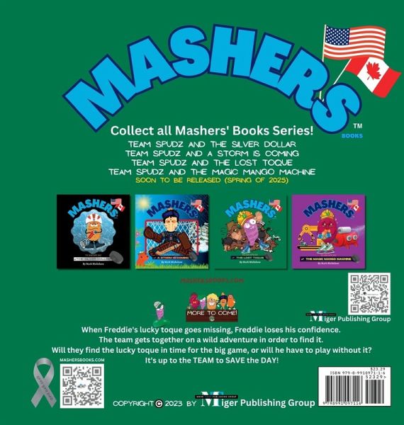 When Freddie's lucky toque goes missing, Freddie loses his confidence. The team gets together on a wild adventure in order to find it. Will they find the lucky toque in time for the big game, or will he have to play without it? It's up to the TEAM to SAVE the DAY! "TEAM SPUDZ" is about five fictional characters who just want to have fun playing their favorite sport, hockey. Join them on their journey as they take Hockey to a whole new level of PLAY! You don't have to only love HOCKEY or POTATOES to LOVE THIS BOOK! The World Is Colorful When You're With The Spudz. Mashers' Books provide stories of life lessons, exciting journeys, and fun reads as "TEAM SPUDZ" bring to life the joys of everyday friendship, overcoming obstacles, perseverance, and having a heck of a time, even if you are just a potato!