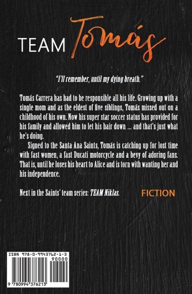 "I'll remember, until my dying breath." Tomás Carrera didn't expect Alice Peterson to rock his world. Growing up with a single mom and as the eldest of five siblings, Tomás has had to be responsible all his life. Now his super star soccer status has provided for his family and allowed him to let his hair down... and that's just what he's doing. Signed to the Santa Ana Saints, Tomás is catching up for lost time with fast women, a fast Ducati motorcycle and a bevy of adoring fans. That is, until he loses his heart to Alice and is torn with wanting her and his independence. Next in the series: Team Niklas