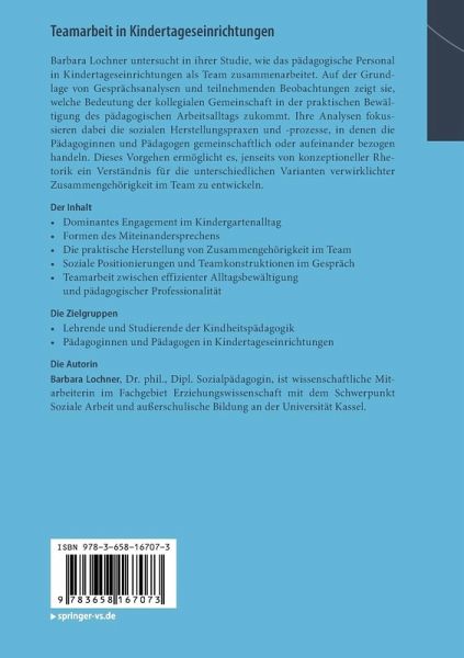 Barbara Lochner untersucht in ihrer Studie, wie das pädagogische Personal in Kindertageseinrichtungen als Team zusammenarbeitet. Auf der Grundlage von Gesprächsanalysen und teilnehmenden Beobachtungen zeigt sie, welche Bedeutung der kollegialen Gemeinschaft in der praktischen Bewältigung des pädagogischen Arbeitsalltags zukommt. Ihre Analysen fokussieren dabei die sozialen Herstellungspraxen und prozesse, in denen die Pädagoginnen und Pädagogen gemeinschaftlich oder aufeinander bezogen handeln. Dieses Vorgehen ermöglicht es, jenseits von konzeptioneller Rhetorik ein Verständnis für die unterschiedlichen Varianten verwirklichter Zusammengehörigkeit im Team zu entwickeln.