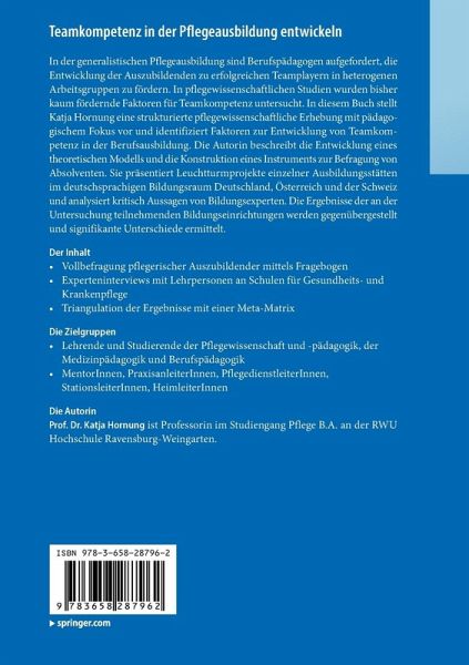 In der generalistischen Pflegeausbildung sind Berufspädagogen aufgefordert, die Entwicklung der Auszubildenden zu erfolgreichen Teamplayern in heterogenen Arbeitsgruppen zu fördern. In pflegewissenschaftlichen Studien wurden bisher kaum fördernde Faktoren für Teamkompetenz untersucht. In diesem Buch stellt Katja Hornung eine strukturierte pflegewissenschaftliche Erhebung mit pädagogischem Fokus vor und identifiziert Faktoren zur Entwicklung von Teamkompetenz in der Berufsausbildung. Die Autorin beschreibt die Entwicklung eines theoretischen Modells und die Konstruktion eines Instruments zur Befragung von Absolventen. Sie präsentiert Leuchtturmprojekte einzelner Ausbildungsstätten im deutschsprachigen Bildungsraum Deutschland, Österreich und der Schweiz und analysiert kritisch Aussagen von Bildungsexperten. Die Ergebnisse der an der Untersuchung teilnehmenden Bildungseinrichtungen werden gegenübergestellt und signifikante Unterschiede ermittelt.