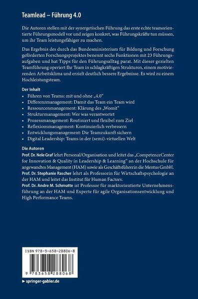 Prof. Dr. Nele Graf ist Professorin für Personal & Organisation an der Hochschule für angewandtes Management sowie Leiterin des Forschungsclusters "Competence Center for Innovation & Quality in Leadership & Learning". In diesem Rahmen hat sie als Projektleiterin das Forschungsprojekt Teamlead betreut. Zudem ist sie Geschäftsführerin der Mentus GmbH, einer Beratung für Personal-, Organisations- und Führungskräfteentwicklung. Als Autorin und Speakerin ist sie zu den Themen Agiles Lernen, Zukunft der Personalentwicklung, Lernkompetenzen und Führung bekannt. Prof. Dr. Stephanie Rascher lehrt als Professorin für Wirtschaftspsychologie an der Hochschule für angewandtes Management in Ismaning bei München und ist Gastdozentin der TU München. Sie beschäftigt sich mit den wissenschaftlichen Aspekten von Human Factors, dem menschlichen Handeln in komplexen Arbeitswelten und dem Wissenstransfer von Hochzuverlässigkeitsorganisationen (HRO) in Wirtschaft, Industrie und Medizin. Stephanie Rascher leitet das Institut für Human Factors und begleitet als systemischer Coach und Moderatorin seit vielen Jahren Organisationen in Veränderungsprozessen. Prof. Dr. Andre M. Schmutte ist Autor, Keynote Speaker und Professor für marktorientierte Unternehmensführung an der Hochschule für angewandtes Management. Er leitet das beratende Institut für Managementkompetenz München und begleitet als ausgewiesener Experte für Business Transformation Unternehmen in der agilen Organisationsentwicklung, der Führung von High-Performance-Teams, im Projektmanagement und in der Prozessoptimierung.