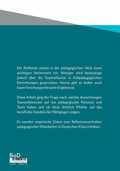 Die Reflexion nimmt in der pädagogischen Welt einen wichtigen Stellenwert ein. Weniger wird heutzutage jedoch über die Teamreflexion in frühpädagogischen Einrichtungen gesprochen. Hierzu gibt es bisher auch kaum forschungsrelevante Ergebnisse.Diese Arbeit ging der Frage nach, welche Auswirkungen Teamreflexionen auf das pädagogische Personal und Team haben und ob diese letztlich Auswirkungen auf das berufliche Handeln der Pädagogen haben.Es wurden empirische Daten zum Reflexionsverhalten pädagogischer Mitarbeiter in Deutschen Kitas erhoben.