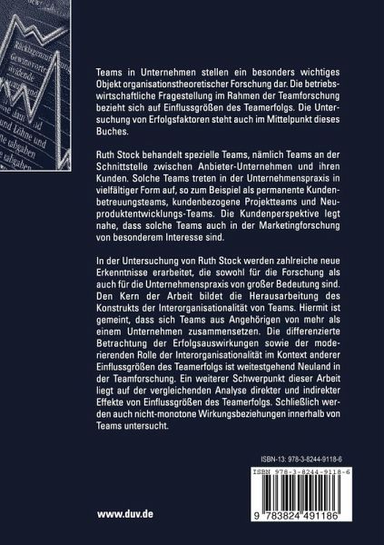 Ruth Stock behandelt spezielle Teams, nämlich Teams an der Schnittstelle zwischen Anbieter-Unternehmen und ihren Kunden. Solche Teams treten in der Unternehmenspraxis in vielfältiger Form auf, so zum Beispiel als permanente Kundenbetreuungsteams, kundenbezogene Projektteams und Neuproduktentwicklungs-Teams. Die Kundenperspektive legt nahe, dass solche Teams auch in der und für die Marketingforschung von besonderem Interesse sind.