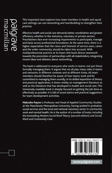In this important text, Malcolm Payne shows how team members in care services can use networking and teambuilding to strengthen their practice by being open to work with wider networks of agencies, professionals and service users. He brings traditional team development up-to-date, including perspectives from research, from management ideas and from professional writings. Each chapter contains a concise account of new ideas in teamwork, practical guidance on teambuilding and teambuilding activities for team members.