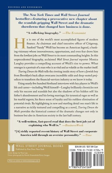 He is one of the world's most accomplished figures of modern finance. As chairman and chief executive officer of Citigroup, Sanford "Sandy" Weill has become an American legend, a banking visionary whose innovativeness, opportunism, and even fear drove him from the lowliest jobs on Wall Street to its most commanding heights. In this unprecedented biography, acclaimed Wall Street Journal reporter Monica Langley provides a compelling account of Weill's rise to power. What emerges is a portrait of a man who is as vital and as volatile as the market itself. Tearing Down the Walls tells the riveting inside story of how a Jewish boy from Brooklyn's back alleys overcame incredible odds and deep-seated prejudices to transform the financial-services industry as we know it today. Using nearly five hundred firsthand interviews with key players in Weill's life and career -- including Weill himself -- Langley brilliantly chronicles not only his success and scandals but also the shadows of his hidden self: his father's abandonment and his loving marriage; his tyrannical rages as well as his tearful regrets; his fierce sense of loyalty and his ruthless elimination of potential rivals. By highlighting in new and startling detail one man's life in a narrative as richly textured and compelling as a novel, Tearing Down the Walls provides the historical context of the dramatic changes not only in business but also in American society in the last half century.