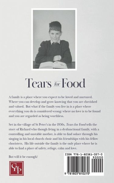 A family is a place where you expect to be loved and nurtured. Where you can develop and grow knowing that you are loved and valued. But what if the family you live in is a place where everything you do is considered wrong: where no love is to be found and you are considered worthless. A place where you heart shrinks from the relentless onslaught of constantly living in fear. What can you cling to so that you not only survive but also develop as a person? Where can you go to and find a place of safety, refuge and peace. Set in the village of St Peter's in the 1950s, Tears for Food tells the story of Richard who though living in a dysfunctional family, with a controlling and unstable mother, is able to find solace through his singing in his local church choir; his friendships with his fellow choristers and his first venture into love with someone else. His life outside the family is the only place where he is able to find a place of safety, refuge and calm. But will it be enough?