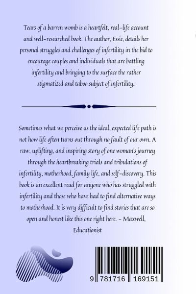 Tears of a barren womb is a heartfelt, real-life account and well researched useful tool that is more than just a book. The author, Essie, details her personal struggles and challenges of infertility in a sole bid to encourage couples and individuals that are battling infertility and speak largely to humanity and bringing to the surface the rather stigmatized and taboo subject of infertility.