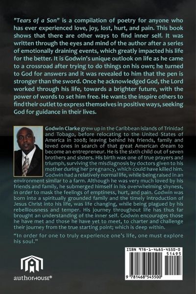 "Tears of a Son" is a compilation of poetry for anyone who has ever experienced love, joy, lost, hurt, and pain. This book shows that there are other ways to find inner self. It was written through the eyes and mind of the author after a series of emotionally draining events, which greatly impacted his life for the better. It is Godwin's unique outlook on life as he came to a crossroad after trying to do things on his own; he turned to God for answers and it was revealed to him that the pen is stronger than the sword. Once he acknowledged God, the Lord worked through his life, towards a brighter future, with the power of words to set him free. He wants the inspire others to find their outlet to express themselves in positive ways, seeking God for guidance in their lives.