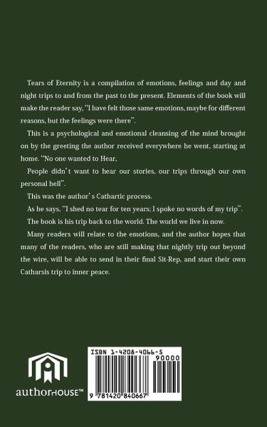 Tears From Eternity is a compilation of emotions, feelings and day and night trips to and from the past to the present. Elements of the book will make the reader say, "I have felt those same emotions, maybe for different reasons, but the feelings were there". This is a psychological and emotional cleansing of the mind brought on by the greeting the author received everywhere he went, starting at home. "No one wanted to Hear, People didn't want to hear our stories, our trips through our own personal hell". This was the authors Catharsis process, his own way of healing. As he says, "I shed no tear for ten years; I spoke no words of my trip". The book is his trip back to the world. The world we live in now. Many readers will relate to the emotions, and the author hopes that many of the readers, who are still making that nightly trip out beyond the wire, will be able to send in their final Sit-Rep, and start their own Catharsis trip to inner peace.