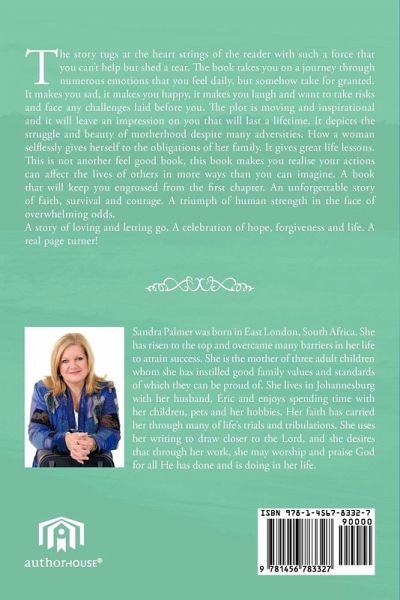 The story tugs at the heart strings of the reader with such a force that you can't help but shed a tear. The book takes you on a journey through numerous emotions that you feel daily, but somehow take for granted. It makes you sad, it makes you happy, it makes you laugh and want to take risks and face any challenges laid before you. The plot is moving and inspirational and it will leave an impression on you that will last a lifetime. It depicts the struggle and beauty of motherhood despite many adversities. How a woman selflessly gives herself to the obligations of her family. It gives great life lessons. This is not another feel good book, this book makes you realise your actions can affect the lives of others in more ways than you can imagine. A book that will keep you engrossed from the first chapter. An unforgettable story of faith, survival and courage. A triumph of human strength in the face of overwhelming odds. A sotry of loving and letting go. A celebration of hope, forgiveness and life. A real page turner!