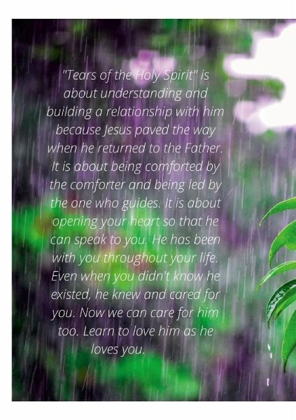 "Tears of the Holy Spirit" is about understanding and building a relationship with him because Jesus paved the way when he returned to the Father. It is about being comforted by the comforter and being led by the one who guides. It is about opening your heart so that he can speak to you. He has been with you throughout your life. Even when you didn't know he existed, he knew and cared for you. Now we can care for him too. Learn to love him as he loves you.