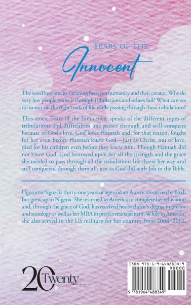 The word love and its meaning between humanity and their creator. Why do very few people make it through tribulations and others fail? What can we do to stay on the right track of life while passing through these tribulations? This story, Tears of the Innocence, speaks of the different types of tribulations and difficulties one passes through and still conquers because of God's love. God loves Hannah and, for that reason, fought for her even before Hannah knew God-just as Christ, out of love, died for his children even before they knew him. Though Hannah did not know God, God bestowed upon her all the strength and the grace she needed to pass through all the tribulations life threw her way and still conquered through them all, just as God did with Job in the Bible. Ugomma Ngozi is thirty-one years of age and an American citizen by birth but grew up in Nigeria. She returned to America to complete her education and, through the grace of God, has received her bachelor's degree in prelaw and sociology as well as her MBA in project management. While in America, she also served in the US military for her country from 2008-2012.