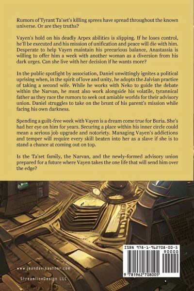 Rumors of Tyrant Ta'set's killing sprees have spread throughout the known universe. Or are they truths? Vayen's hold on his deadly Arpex abilities is slipping. If he loses control, he'll be executed and his mission of unification and peace will die with him. Desperate to help Vayen maintain his precarious balance, Anastassia is willing to offer him a week with another woman as a diversion from his dark urges. Can she live with her decision if he wants more? In the public spotlight by association, Daniel unwittingly ignites a political uprising when, in the spirit of love and unity, he adopts the Jalvian practice of taking a second wife. While he works with Neko to guide the debate within the Narvan, he must also work alongside his volatile, tyrannical father as they race the rumors to seek out amiable worlds for their advisory union. Daniel struggles to take on the brunt of his parent's mission while facing his own darkness. Spending a guilt-free week with Vayen is a dream come true for Buria. She's had her eye on him for years. Securing a place within his inner circle could mean a serious job upgrade and notoriety. Managing Vayen's addictions and temper will require every skill beaten into her as a slave if she is to stand a chance at coming out on top. Is the Ta'set family, the Narvan, and the newly-formed advisory union prepared for a future where Vayen takes the one life that will send him over the edge?