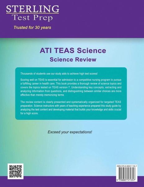 ATI TEAS prep bestseller - higher score guarantee! Thousands of students use Sterling Test Prep study aids to achieve high test scores! With a thorough review of all tested science topics, this comprehensive guide prepares you to achieve a high score on TEAS version 7. ¿¿Scoring well on TEAS is essential for admission to a competitive nursing program to pursue a fulfilling career in health care. This book helps you develop the knowledge to quickly answer questions tested on the science section. Understanding key concepts, extracting and analyzing information from questions, and distinguishing between similar choices are more effective than merely memorizing terms. This book provides a thorough review of science topics and covers the topics tested on TEAS version 7. Science instructors with years of teaching experience prepared this self-teaching guide by analyzing the test content and developing material that builds your knowledge and skills crucial for a highs core. Our editors reviewed and systematized the content to ensure adherence to the current test requirements. These experts prepare students for standardized tests and have coached thousands of students on test preparation and successful admission strategies. The review content is clearly presented and systematically organized for targeted TEAS preparation. By reading these review chapters thoroughly, you will learn the important foundations and essential details. This prepares you for the test and will significantly improve your TEAS score.