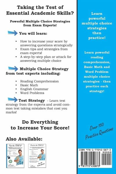Learn and Practice Proven multiple choice strategies for Reading Comprehension, Word Problems, English Grammar and Basic Math! If you are preparing for the Test of Essential Academic Skills, you probably want all the help you can get! TEAS Test Strategy is your complete guide to answering multiple choice questions! You will learn: Powerful multiple choice strategies with practice questions - Learn 15 powerful multiple choice strategies and then practice. Answer key for all practice questions with extensive commentary including tips, short-cuts and strategies. How to prepare for a multiple choice exam - make sure you are preparing properly and not wasting valuable study time! Who does well on multiple choice exams and who does not - and how to make sure you do! How to handle trick questions - usually there are one or two trick questions to separate the really good students from the rest - tips and strategies to handle these special questions. Step-by-step strategy for answering multiple choice - on any subject! Common Mistakes on a Test - and how to avoid them How to avoid test anxiety - how to avoid one of the most common reasons for low scores on a test How to prepare for a test - proper preparation for your exam will definitely boost your score! How to psych yourself up for a test - tips on the the all-important mental preparation! Learn what you must do in the test room Includes over 150 practice questions! Once you learn our powerful multiple choice strategy techniques, practice them right away on Reading Comprehension, basic math, English Grammar and word problems! Also included is How to Take a Test - The Complete Guide Let's face it: test-taking is really not easy! While some people seem to have the natural ability to know what to study, how to absorb and retain information, and how to stay calm enough while actually taking a test to earn a great score, most of us find taking tests to be sheer misery. This is one of the most important chapters! Here you will find out: How to Take a Test - The basics In the Test Room - What you MUST do Common Mistakes on a Test - And how to avoid them Mental Prep - How to psych yourself up for a test Maybe you have read this kind of thing before, and maybe feel you don't need it, and you are not sure if you are going to buy this book. Remember though, it only a few percentage points divide the PASS from the FAIL students. Even if our test tips increase your score by a few percentage points, isn't that worth it? Remember it only a few percentage points divide the PASS from the FAIL students. Why not do everything you can to increase your score?