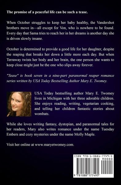The promise of a peaceful life can be such a tease. When October struggles to keep her baby healthy, the Vandershot brothers move in-all except for Von, who is nowhere to be found. Every day that Sama tries to reach her in her dreams is another day she is driven slowly insane. October is determined to provide a good life for her daughter, despite the reaping that breaks her down a little more each day. But when Terraway twists her body and her brain, the one person she wants to keep close might just be the one who slips away forever. If you love Bella Forrest, Cassandra Clare, and falling in love with the bad boy, you'll devour the "Terraway" series by Mary E. Twomey. Tease is book seven in the 9-part paranormal reaper romance series, written by USA Today Bestselling Author Mary E. Twomey.