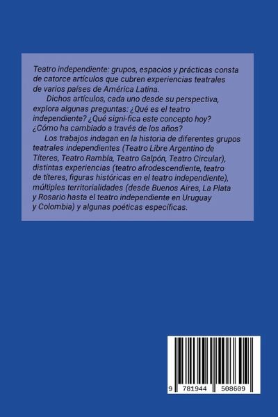 Teatro independiente: grupos, espacios y prácticas consta de catorce artículos que cubren experiencias teatrales de varios países de América Latina. Dichos artículos, cada uno des-de su perspectiva, explora algunas preguntas: ¿Qué es el teatro independiente? ¿Qué signi-fica este concepto hoy? ¿Cómo ha cambiado a través de los años? Los trabajos indagan en la historia de diferentes grupos teatrales independientes (Teatro Libre Argentino de Títeres, Teatro Rambla, Teatro Galpón, Teatro Circular), dis-tintas experiencias (teatro afrodescendiente, teatro de títeres, figuras históricas en el tea-tro independiente), múltiples territorialidades (desde Buenos Aires, La Plata y Rosario hasta el teatro independiente en Uruguay y Colombia) y algunas poéticas específicas.
